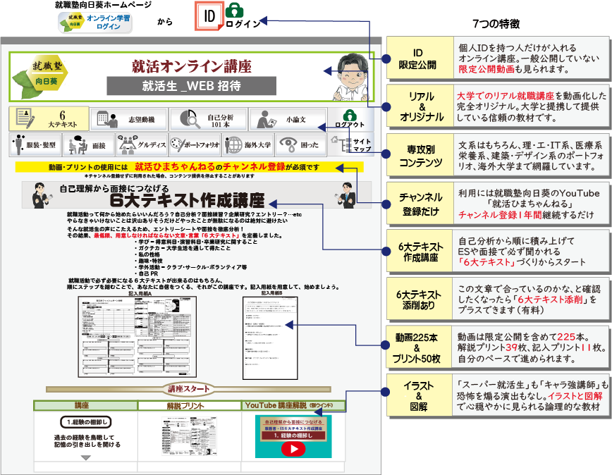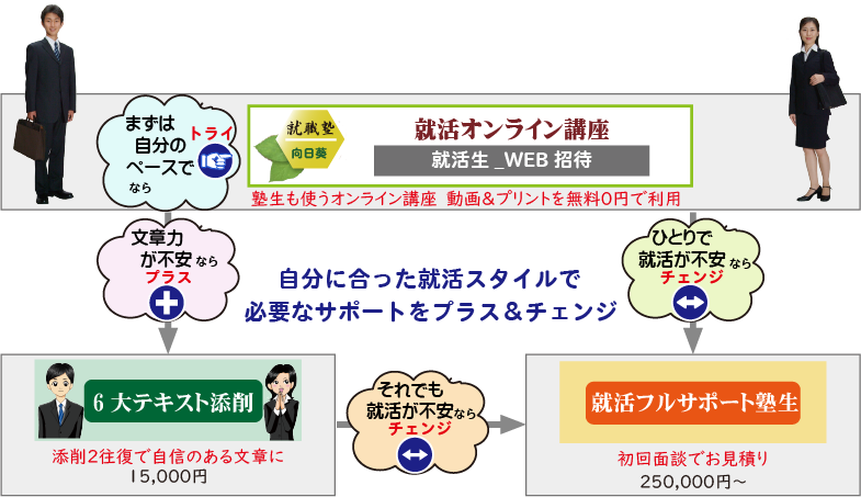 就職塾向日葵のオンライン講座は、 6大テキスト、志望動機、自己分析、小論文、服装・髪型、面接、GD、ポートフォリオ、海外大学留学中、まで充実。 教材は完全オリジナル。動画は限定公開動画を含む225本、プリント50枚。 文系/理・工・IT系/医療・栄養系/建築系・デザイン系の学生に必要なコンテンツを無料で開放しています。 |