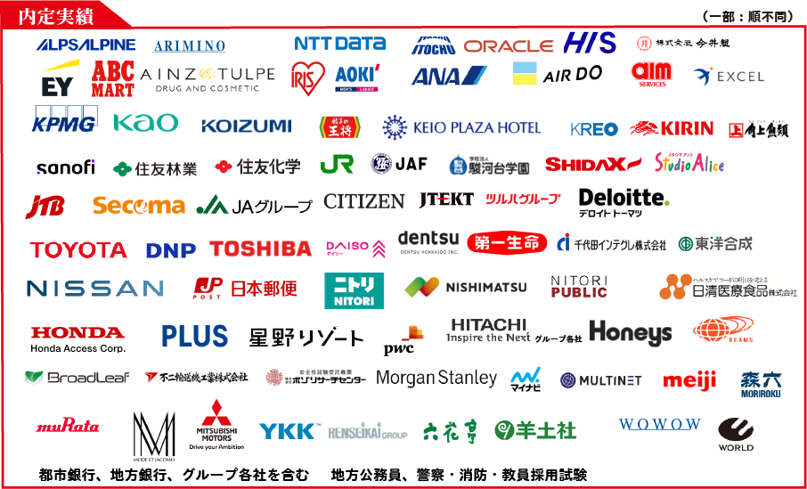 1.文、理、デザイン、教育、医療、栄養、幼保まで幅広い学びに対応 2.メーカー、商社、金融、広告、IT、小売、運輸、サービスまで 多岐の業種 3.研究、技術、ロジスティクス、経理、営業、デザイナー アテンダントなど多職種 4.海外就職、外資系日本勤務、大都市、地方まで様々な勤務地 5.コンサルビッグ4から公務員や教員採用試験との併願まで |