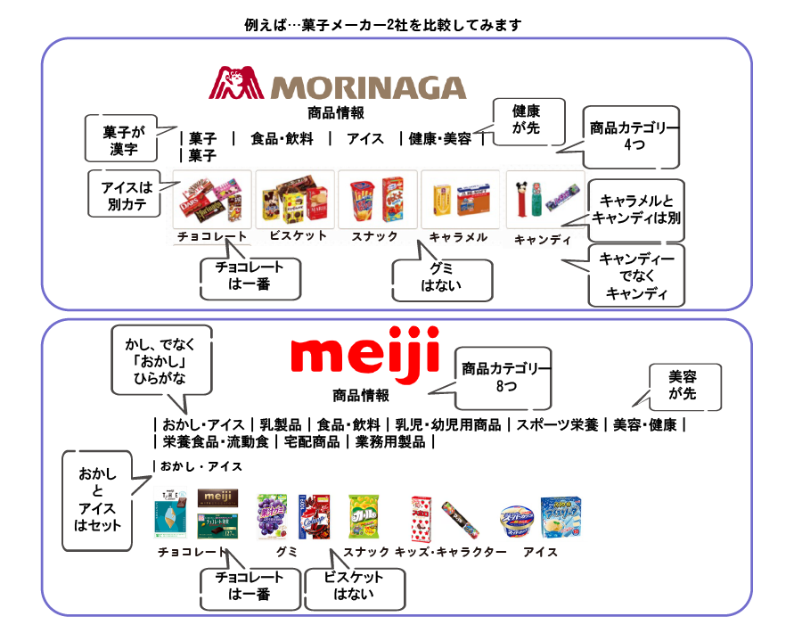 「商品情報」と主力製品のカテゴリーを並べて比較すると、これだけの共通点と違いが見えてきました。 |