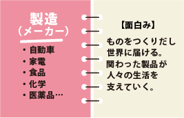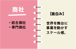 ・総合商社は「資源・インフラ投資+事業会社経営」にシフト。 派手に見えて、地道な調整と投資判断がカギを握る世界。 ◎「この分野で新しいビジネスを仕掛たい」と言いたい。 |