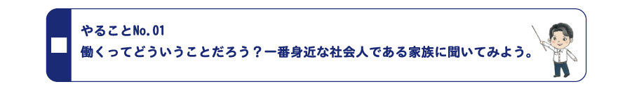 No.01□家族から長年働いてきた経験(会社・業種・職種・業務内容・苦労・喜び)をよく聞かされている No.02□「働かざる者食うべからず」という話は、日頃から耳にしてるし、そう思う No.03□日頃から新聞やニュースを見て、政治・経済・事件について、家族と議論している No.04□新卒で入った会社が合わなかったら、転職すればいい」という考えは甘いと思う No.05□好きなこと・やりたいこと」は、入社後10年以降の社員(=管理監督職)ができることだと理解している No.06□私は、「お金を払う学生」と「お金をもらう社会人」の違いをしっかり認識していると思う |