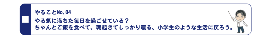 No.21□朝は毎日7:00には起き、夜は12時前に寝るように心がけている No.22□食事は1日3食、バランスを考えて摂っている No.23□人見知りをしないで、相手の目を見て話をすることが出来る No.24□約束の時間に遅れそうな時は連絡を入れたり、提出物は前日までに出すようにしたりできている。 No.25□一人で知らない場所に行く時、事前に電車や行き方を調べたり、人に聞いたりして行動できる自信がある |