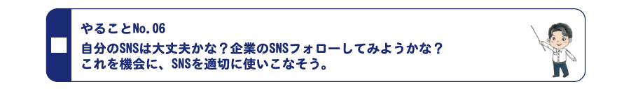 No.38□SNS(インスタグラム、ツイッター、フェイスブック、クラブハウス、ノート等)で情報を発信している No.39□アイコンは、家族を含む他人やキャラクターを使っておらず、肖像権・著作権的に問題ない No.40□アップした情報や写真、動画(以下、投稿)には、現在地や恋人の有無、個人情報を掲載していない No.41□投稿には、差別・攻撃・中傷・悪口など、他人を傷つける内容を含んでいない No.42□投稿には、いたずら・隠し撮り・撮影禁止場所への侵入等の迷惑行為は含んでいない No.43□投稿には、タトゥー・深夜営業店など、風営法や暴対法を想起させるものが写りこんでいない No.44□投稿は、誰に見られても問題のないもの、誰がみても不快感のないもの、である No.45□時間限定のタイムラインやストーリーでも、No40-44の配慮をしている。 No.46□人事採用担当が、応募者名でインターネット検索をかけることを知っている No.47□就活用のアカウントを持っている No.48□裏アカや鍵アカであっても特定される可能性があることを知っている |