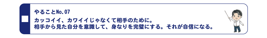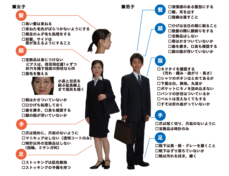 No.49□就職活動用のスーツとして、黒か紺色の、無地(ストライプNG)を用意できている No.50□就職活動用のシャツとして、白、無地(ストライプ・地模様NG)を3枚以上用意できている No.51□就職活動用の腕時計を用意してある No.52□就職活動用の鞄として、A4サイズの書類が入るものを用意できている No.53□就職活動用の靴として、サイズがピッタリ合っていて、長時間歩くことができるものを用意できている No.54□就職活動用として、フォーマルな(奇抜な色デザインNG)めがね、又はコンタクトを用意できている No.55□就職活動に向けて、指輪やミサンガ(手首・足首)は外している No.56□就職活動に向けて、髪の色を黒に戻しはじめている |