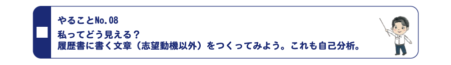 No.57□学校が提供している履歴書の存在と、書くべき項目を知っている No.58□履歴書やエントリーシートに書く字の「綺麗さ」に自信がある No.59□履歴書やエントリーシートを書く時に使う、「勝負ペン」を10本以上用意してある No.60□志望動機において企業が聞きたいことは、ホームページに書かれていることを知っている No.61□学校が提供している履歴書で、文字数まで合わせて下書きしてある(志望動機以外) No.62□A3サイズの履歴書やエントリーシートを広げられるよう机が整頓されている No.63□履歴書用証明写真はデジタルデータと紙焼き10枚以上用意してある No.64□履歴書用証明写真は、書類選考や面接だけでなく、配属にまで影響することを知っている ![]() |