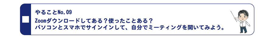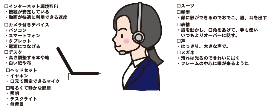 No.65□パソコンにカメラがついている No.66□パソコンに接続して会話ができるヘッドセット(マイク機能付きイヤホン)がある No.67□パソコンは、顔が正対して明るく映るように、高さや照明の明るさを調整してある No.68□パソコンは背景が壁になる位置にセットしてある。または映る部屋は整頓されている No.69□Zoomはパソコンにダウンロードしてある No.70□oomを使ってミーティングをしたことがある |