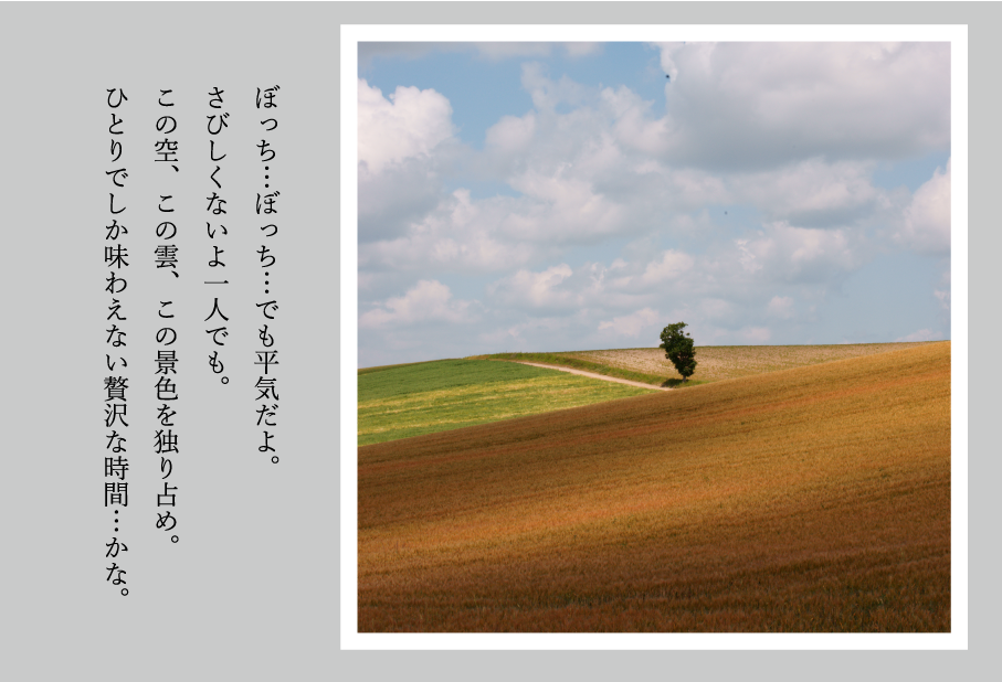 ぼっち…ぼっち…でも平気だよ。 さびしくないよ一人でも。 この空、この雲、この景色を独り占め。