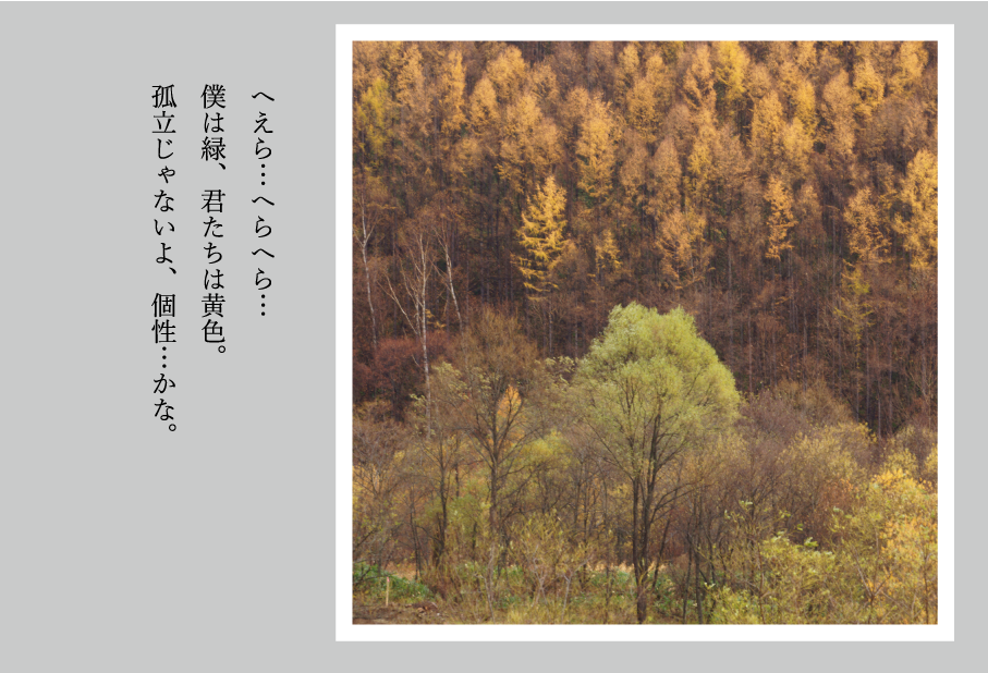 (黄色い針葉樹と緑色の広葉樹_晩秋)
