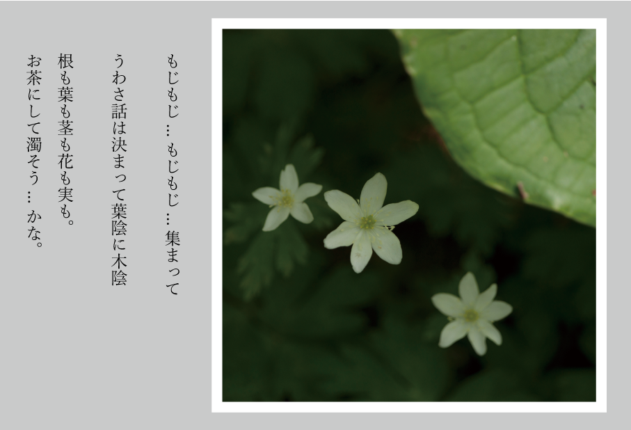 もじもじ...もじもじ...集まって うわさ話は決まって葉陰に木陰 根も葉も茎も花も実も。