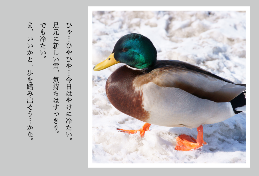 ひゃ…ひやひや…今日はやけに冷たい。 足元に新しい雪、気持ちはすっきり。 でも冷たい。