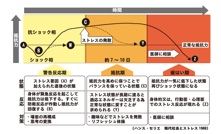 (A)ストレス要因が加えられた直後、身体が緊急反応を起こして (C)抵抗力を高めに保つことで、なんとかバランスを保っている状態が続くと、 (Y)趣味やリフレッシュ体操などで、ストレスを発散し、 |
