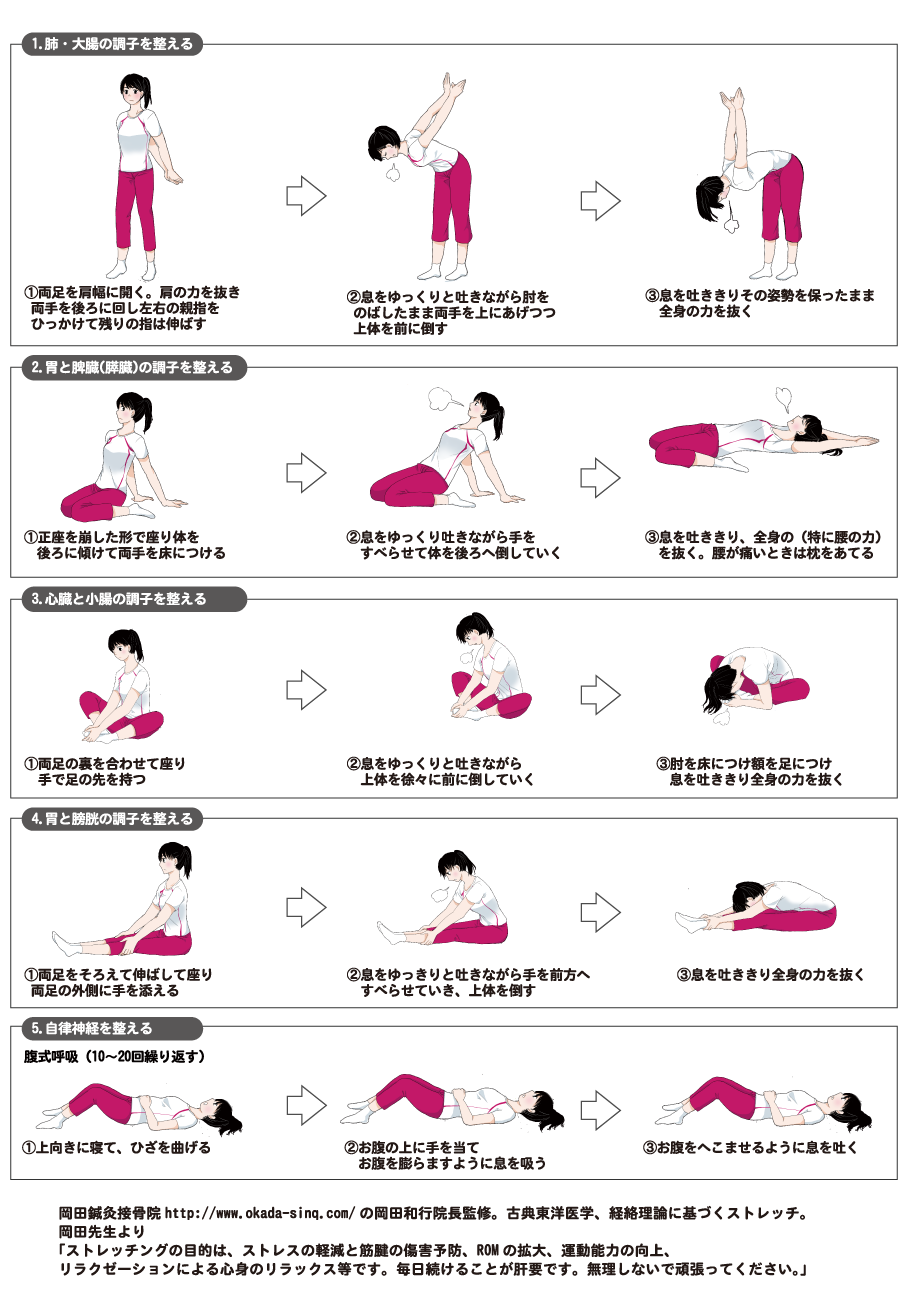 心を体は密接な関係があります。身体を動かして、今日の気持ちをリフレッシュしましょう。 ひとつのポーズで2~4回、30秒~1分位が基本です。 反動をつけずに、ゆっくり伸ばし、痛みを感じない程度の最大伸長姿勢で行います。 1日何回かに分けて、毎日行うことが理想です。 週に3回以上行わないと効果は半減します。 最初は、楽な体制でのストレッチ(easy stretch)で30秒、 少し強いストレッチ(developmental stretch)で30秒、と二段階で行うとよいでしょう。 |