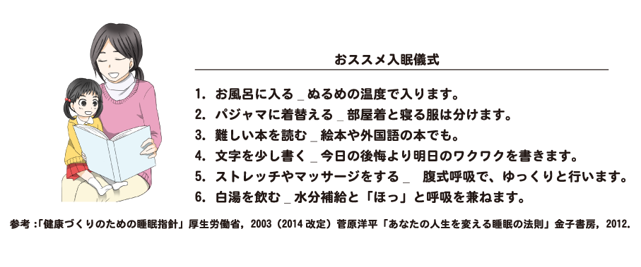 私たちの脳は、慣れていることを行うこと「ルーティン」に安心感を覚えます。 「ルーティン」を行うことで、副交感神経を優位にして、落ち着かせ眠りやすくする これを「入眠儀式」と言います。 さあ、これをすると言うことは、寝る時間なんだよ」と脳と身体に教え 「ルーティン」の力を借りて眠気を誘います。 逆に、興奮して交感神経を活発にさせてしまうものは入眠儀式には向きません。 寝る前にランニングをする、お酒を飲む、布団に入ってスマホを見るなど。 特にスマホはブルーライトの影響もあり、眠りが浅くなりやすいので、ご注意を。 |